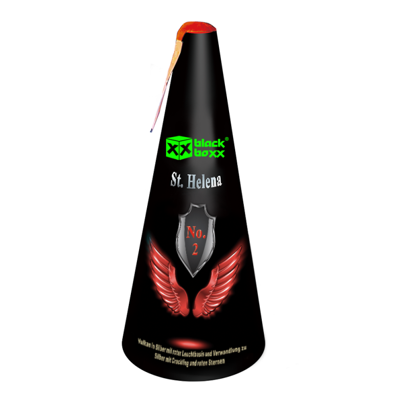 Großer 8" Vulkan in Silber mit roter Leuchtbasis und Verwandlung zu Silber mit Crackling und roten Sternen, raucharm und hoch steigend